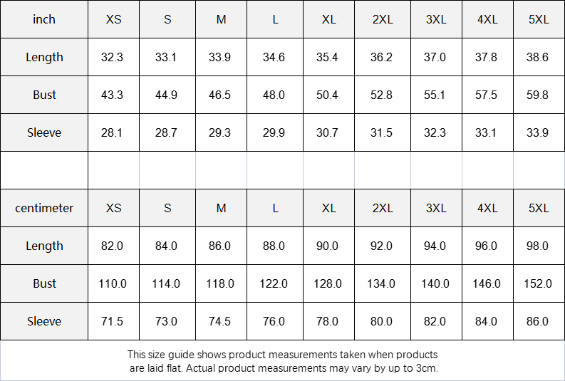 | Centimeter | XS | S | M | L | XL | 2XL | 3XL | 4XL | 5XL |