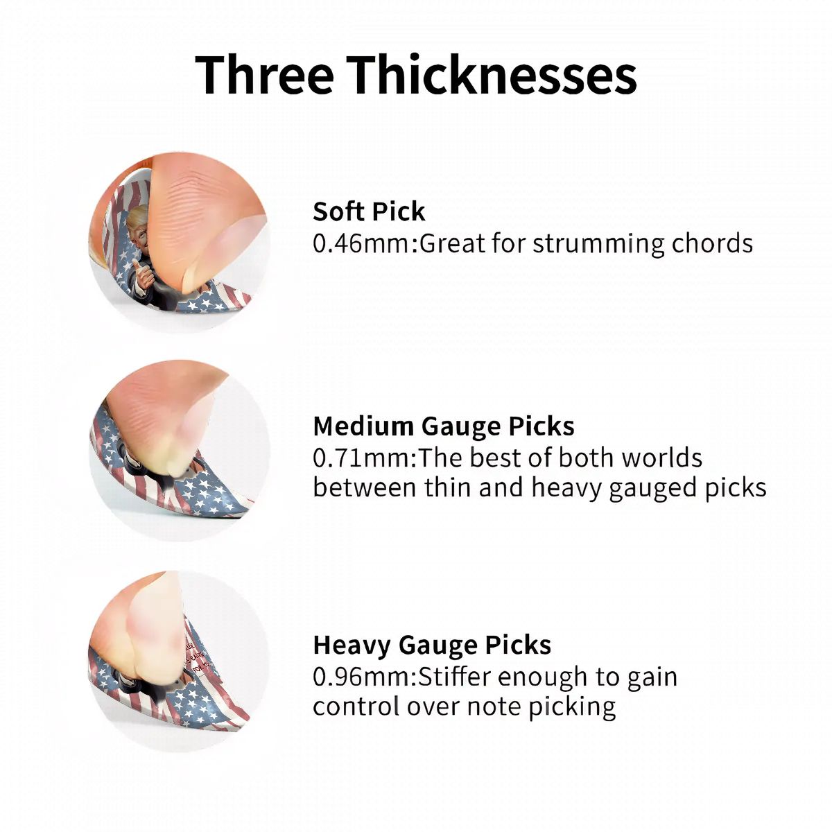 It feels comfortable, has smooth edges, strong wear resistance and toughness, clear patterns, and 3 thicknesses to choose from, giving you a different musical experience. The pick makes the guitar tone clear, and picks of different thicknesses have different tones. Thin picks have bright and crisp tones, while thick picks have thick and full tones. Customizable patterns.