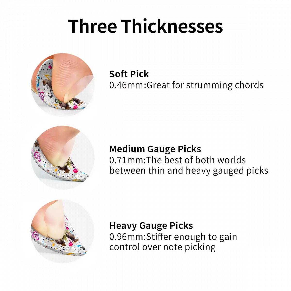 It feels comfortable, has smooth edges, strong wear resistance and toughness, clear patterns, and 3 thicknesses to choose from, giving you a different musical experience. The pick makes the guitar tone clear, and picks of different thicknesses have different tones. Thin picks have bright and crisp tones, while thick picks have thick and full tones. Customizable patterns.
