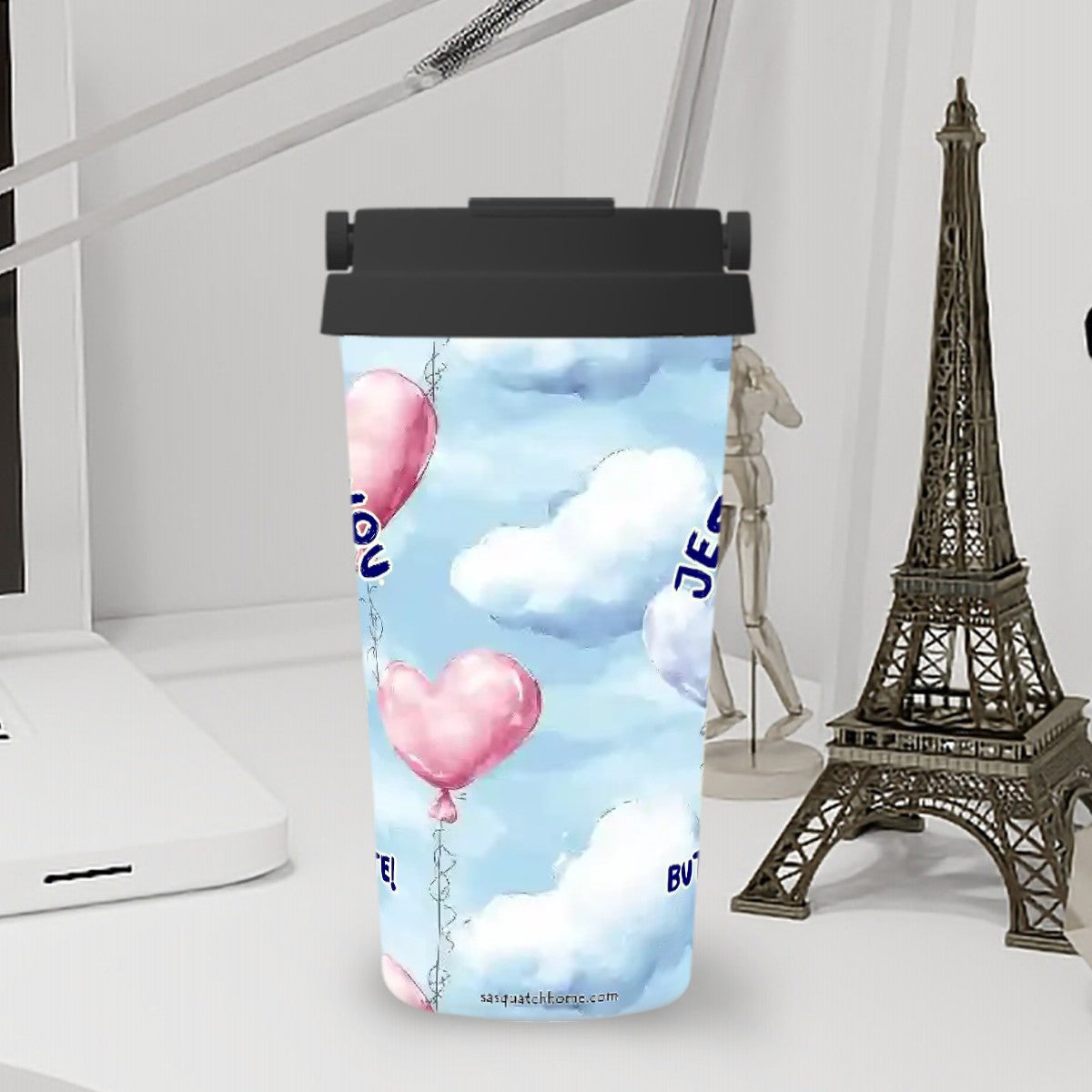 Bigfoot / Sasquatch "Jesus loves you..", 17 oz Insulated Coffee Mug with Lid & Carrying Handle