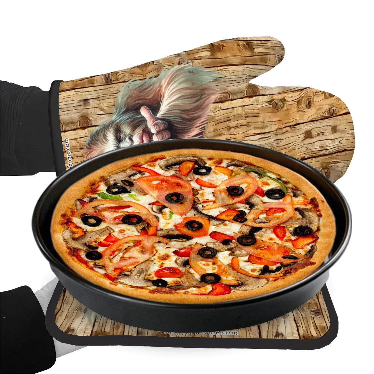 Set of 2 Oven Mitt and Pot Holder - Bigfoot Sasquatch Blow Kiss