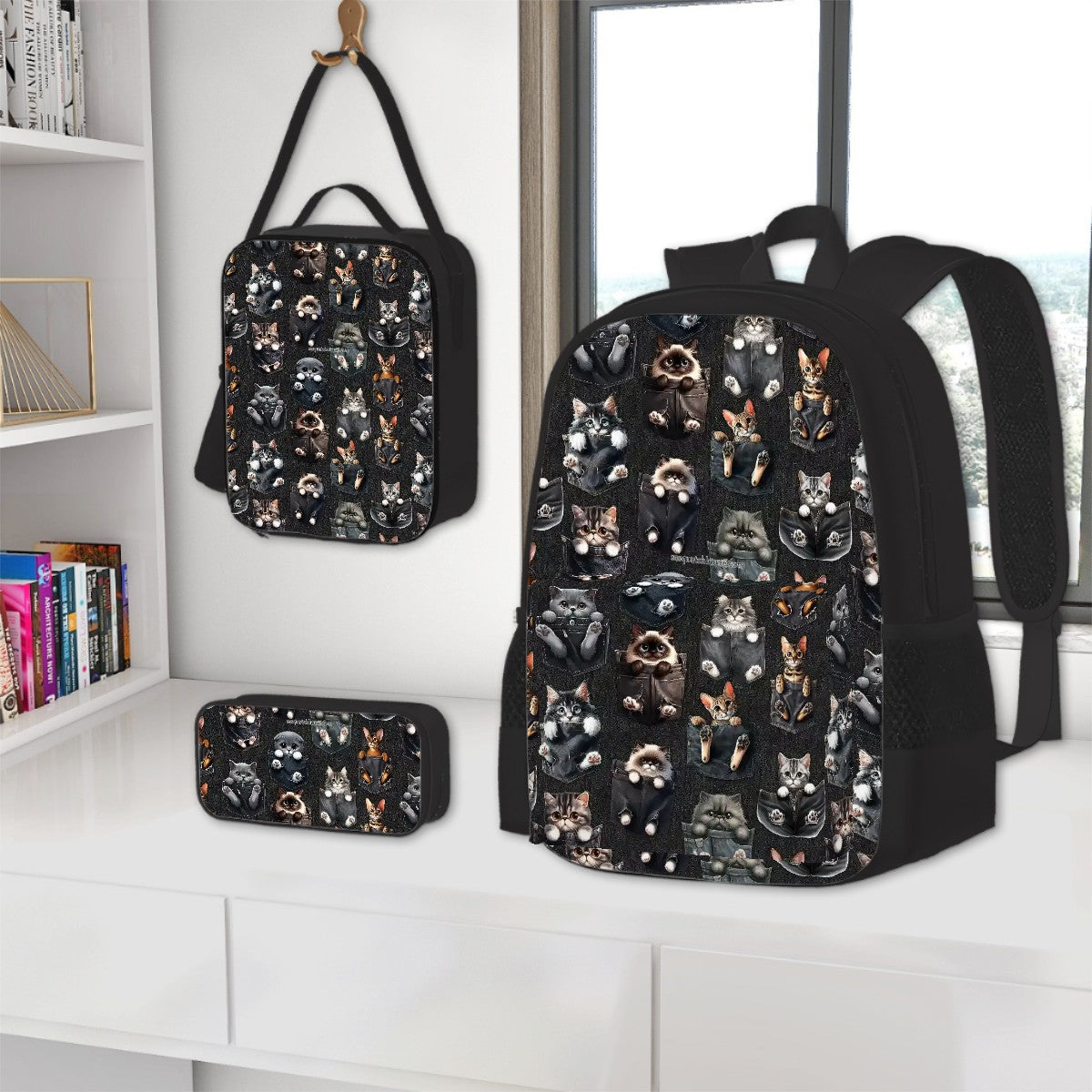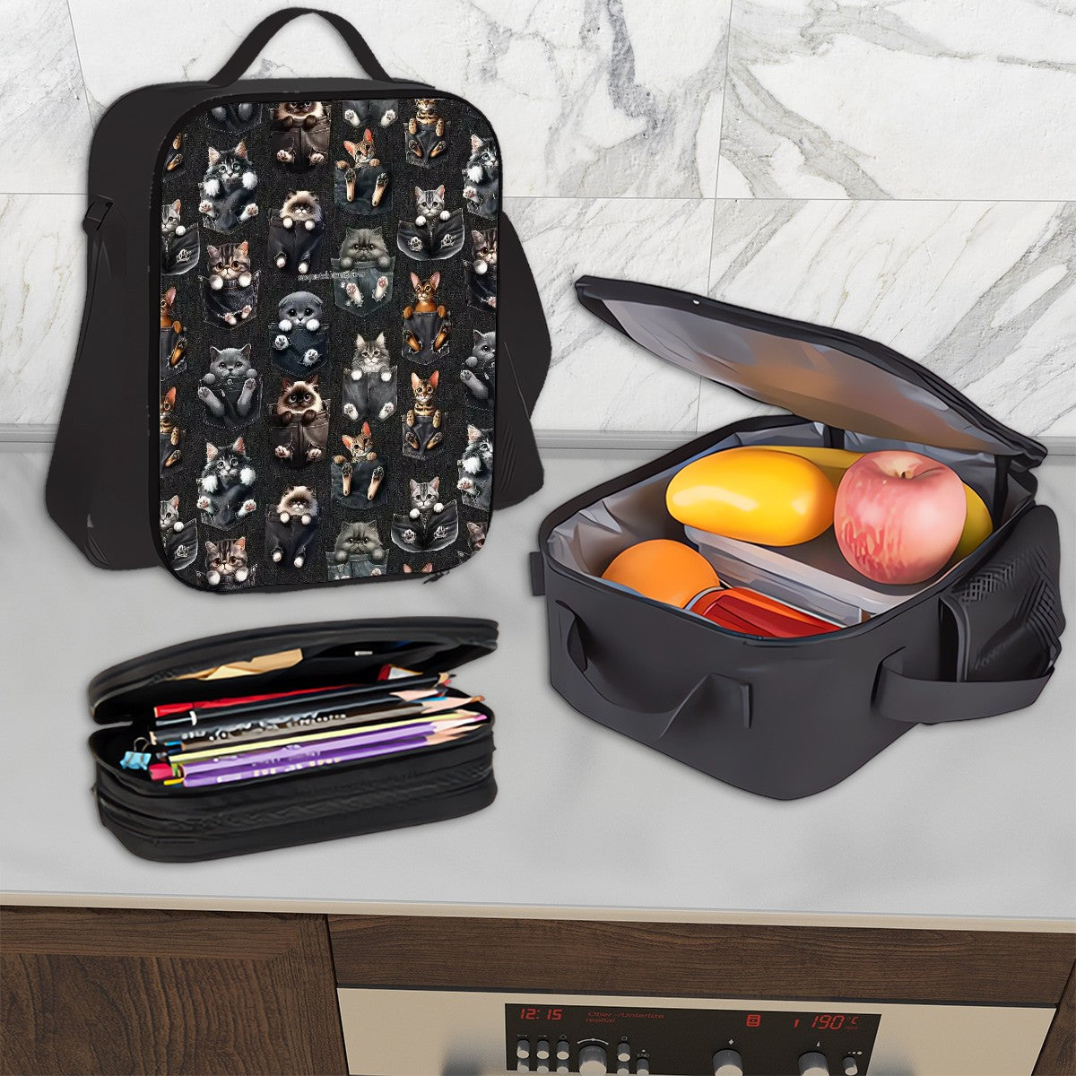Kittens in Pockets, 3 Piece Bag Set – Oxford Backpack, Lunch Bag, Pencil Pouch